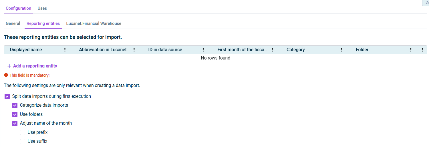 Activate the Split data imports during first execution check box to split the data import into multiple import files. When the data import is executed for the first time, a separate import file is created for each defined reporting entity. If you do not activate the check box, one import file is created for the entire data import.
