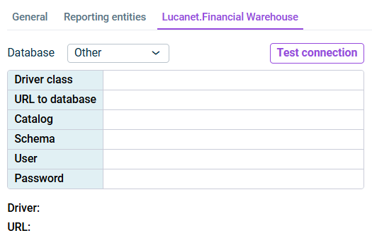 The following connection information must be specified on the Lucanet.Financial Warehouse tab: