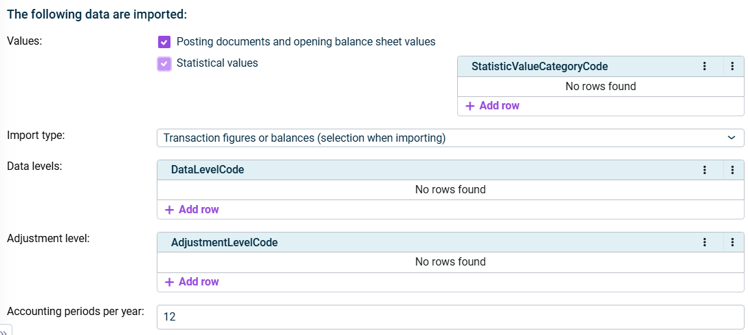 - Statistical values: Optional. If activated, you must enter the code for at least one value category in the displayed StatisticValueCategoryCode column.