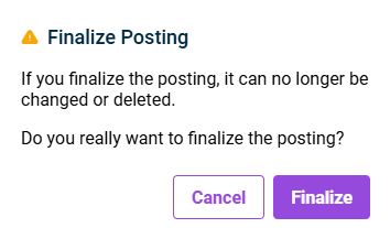 To finalize a posting, right-click the name of the desired posting in the Journal and choose Finalize posting from the context menu. Confirm the displayed message: