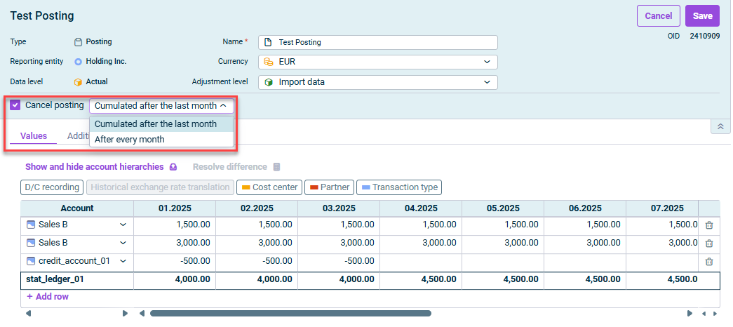 Canceling a posting does not create a new, separate posting, but rather “reverses” the posting values defined in the posting within the defined period.