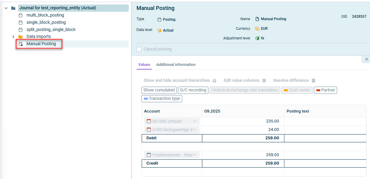 Manual postings can be created for all reporting entities or consolidation areas in the Journals workspace, for periods that are not locked for editing.