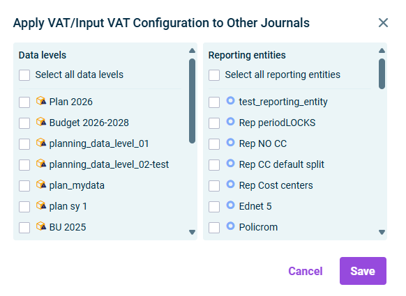 - Select the combination of data level and reporting entity from which you want to apply the VAT configuration to other journals.