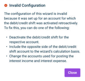 The error arises when the Current account interest wizard has been set up for an account for which a debit/credit shift is activated subsequently in its superordinate item, and in case that the specified accounts for the interest income and interest expense are in the same item as the debit/credit shift that was set up subsequently.