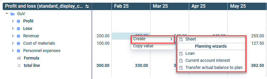 - Right-click in the row of the ledger hierarchy for which a sheet should be created and choose Create | Current acount interest.