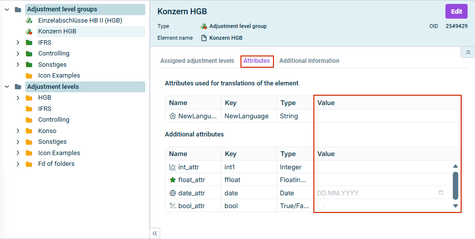 The configuration of attributes is generally possible for all dimensions, except for fiscal years. However, only the attributes that were defined in Lucanet.Financial Client in the Attributes workspace and have been activated for a dimension are displayed and can be edited.