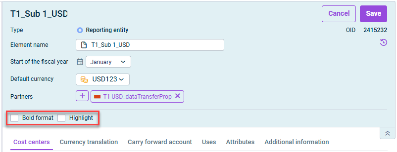 To format elements in bold or highlight them, you need write permissions for the respective workspaces. You can assign read and write permissions in the User management workspace of the Lucanet CFO Solution Platform (see Creating and Editing Users for the Lucanet CFO Solution Platform).