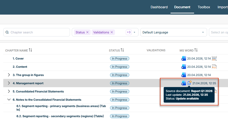 When the source chapter of a Word reference is updated, the Cockpit highlights the reference icon in the MS Word column. In addition, a tooltip on Status displays the Update available note: