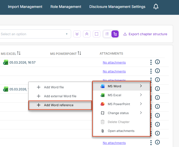 With Word references in Disclosure Management, you can reuse the content of a chapter from one report in a chapter of another report.