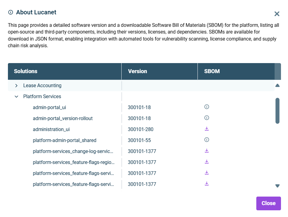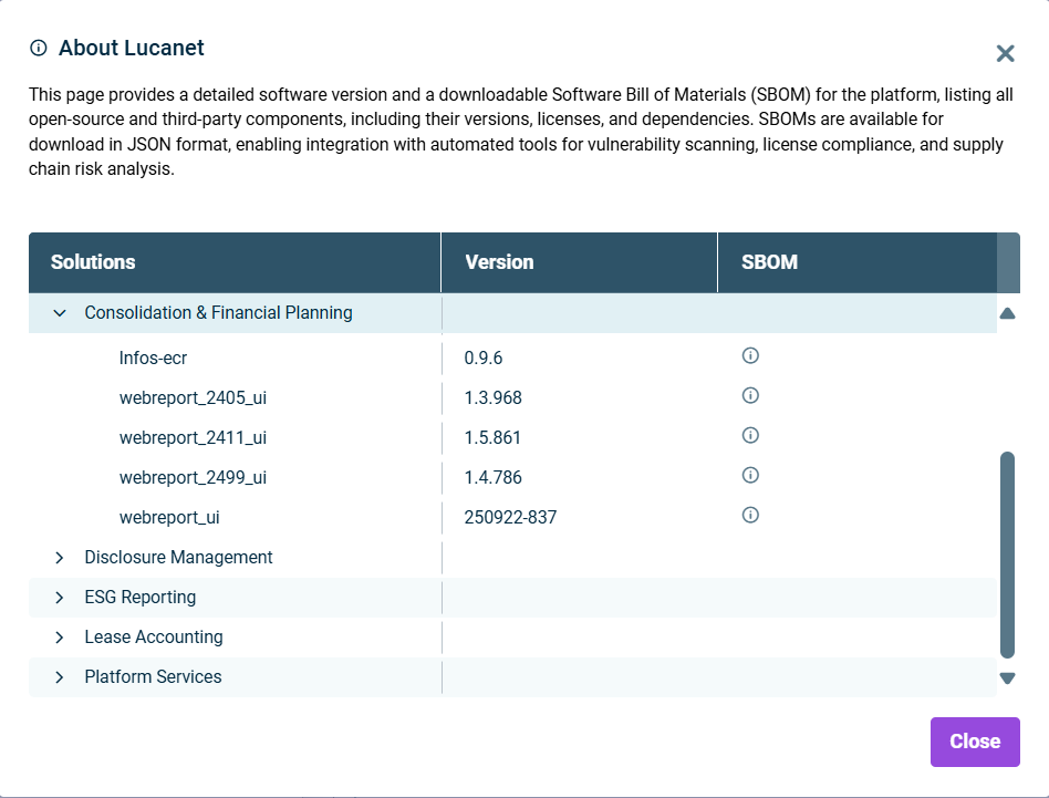 The Lucanet CFO Solution Platform provides comprehensive Software Bill of Materials (SBOM) documentation to enhance security, transparency and compliance. This information is exclusively available to administrators via the About Lucanet option in the main menu.