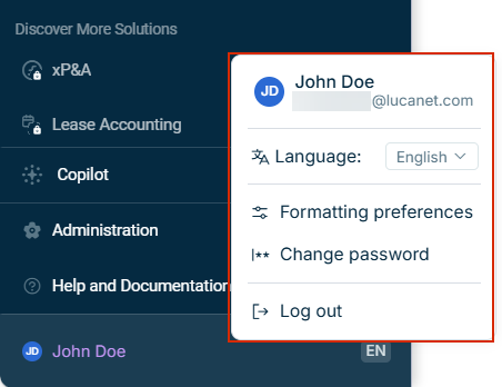 The Lucanet CFO Solution Platform is the user interface for end users and Lucanet administrators in the web view. This page contains information about the structure of the user interface and the most important elements.