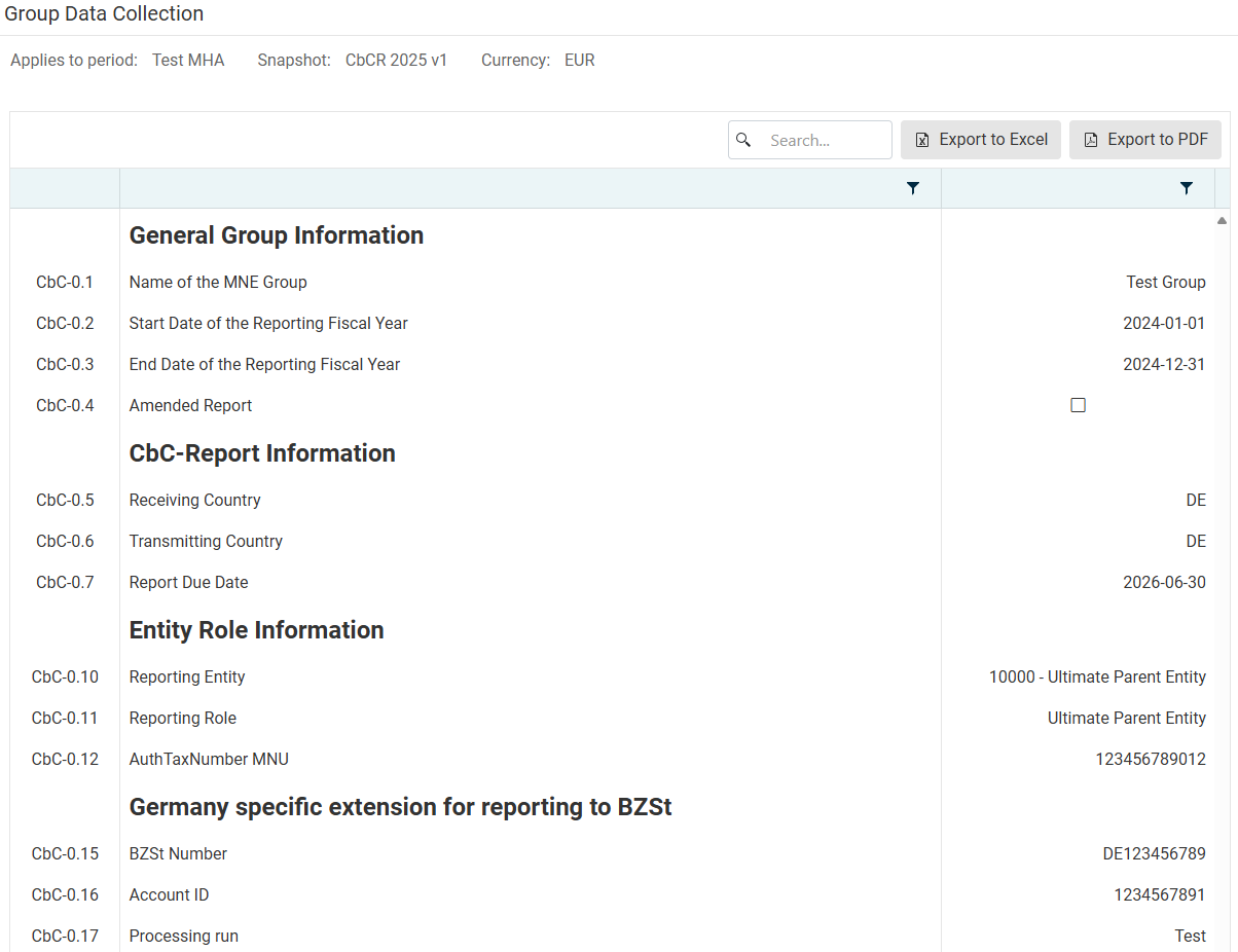 The Group Data workspace displays the information from the Group Data Collection workspace as it was when the snapshot was created. This information is a required part of the Country-by-Country report. Thus, even though the group data has no direct effect on the calculations, you need to create a new snapshot after making changes to the Group Data Collection.