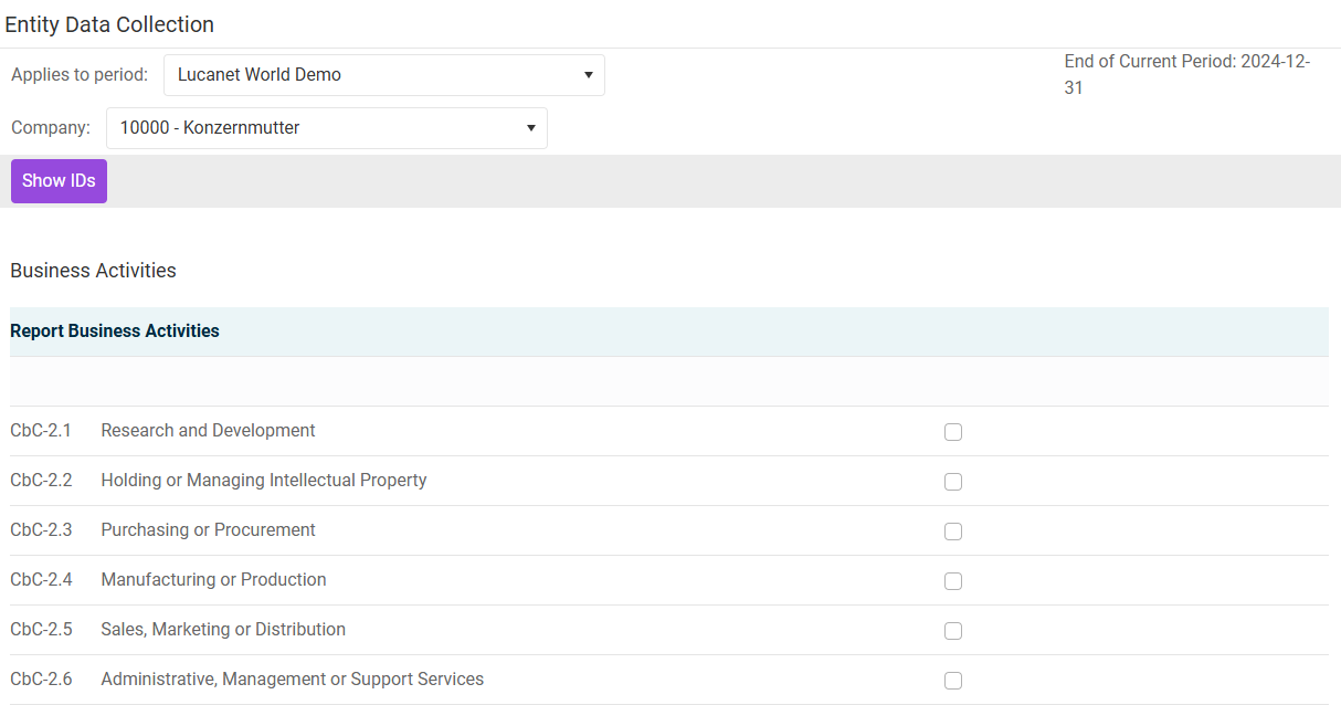 The Business Activities workspace can be found at Country-by-Country Reporting | Entity Data Collection. The workspace is displayed as follows: