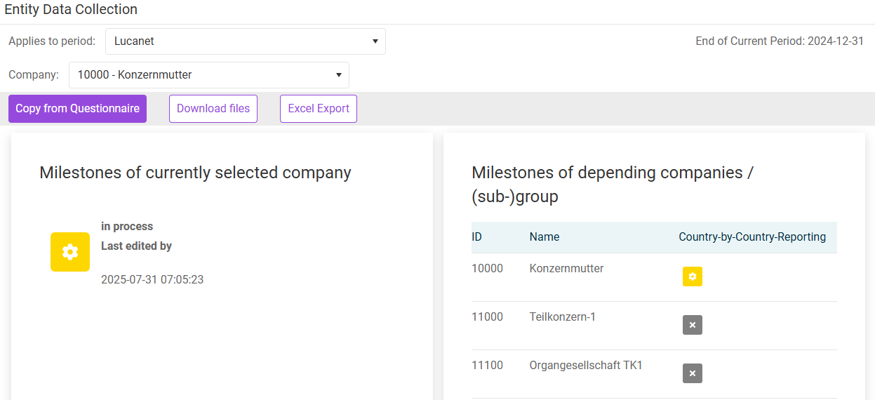 The Home workspace of the Entity Data Collection displays the status of the selected entity’s milestone as well as of the milestones of all dependent entities and entities in the same subgroup. Users with the necessary rights can also change the status of an individual milestone by clicking it.