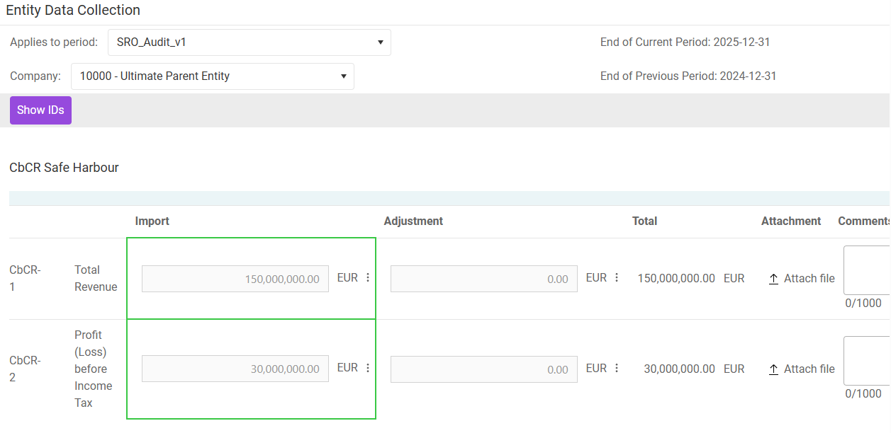 This workspace stores information relevant to the simplified ETR test and the de minimis exclusion that are part of the transitional safe harbour rules. The entries in this workspace must be in accordance with the corresponding entries in the CE’s country-by-country report. Hence, Lucanet highly recommends that users who also use the CbCR module import CbCR safe harbour data from there.