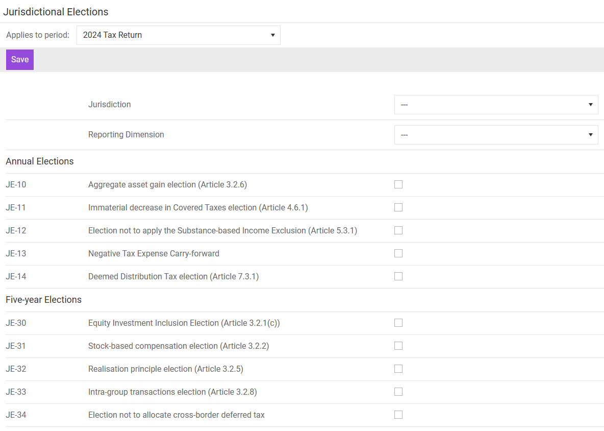 - Some elections have a direct effect on the calculations in the Pillar 2 module, for example JE-10. Others, like JE-33, do not impact the calculations but must still be reported to the tax authorities if exercised.