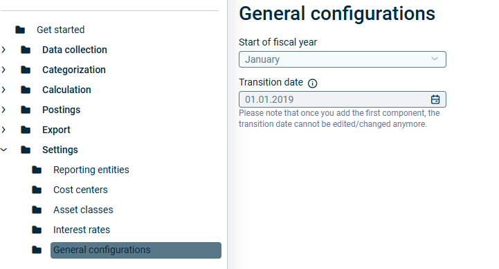 The Start of fiscal year and Transition date fields become disabled and cannot be changed once the first component is created.