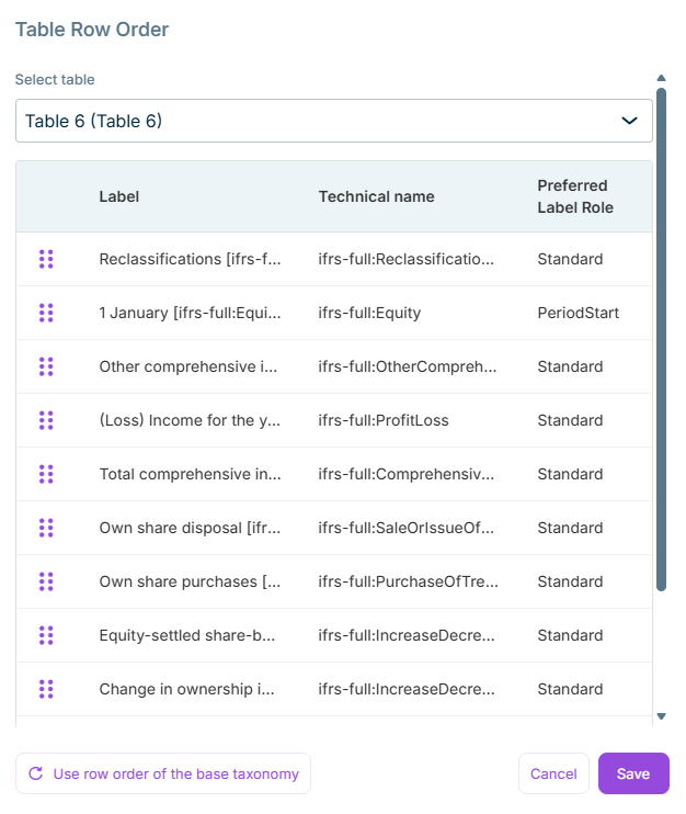 You can also reset the row order to the base taxonomy by clicking the button Use Row Order of the Base Taxonomy.