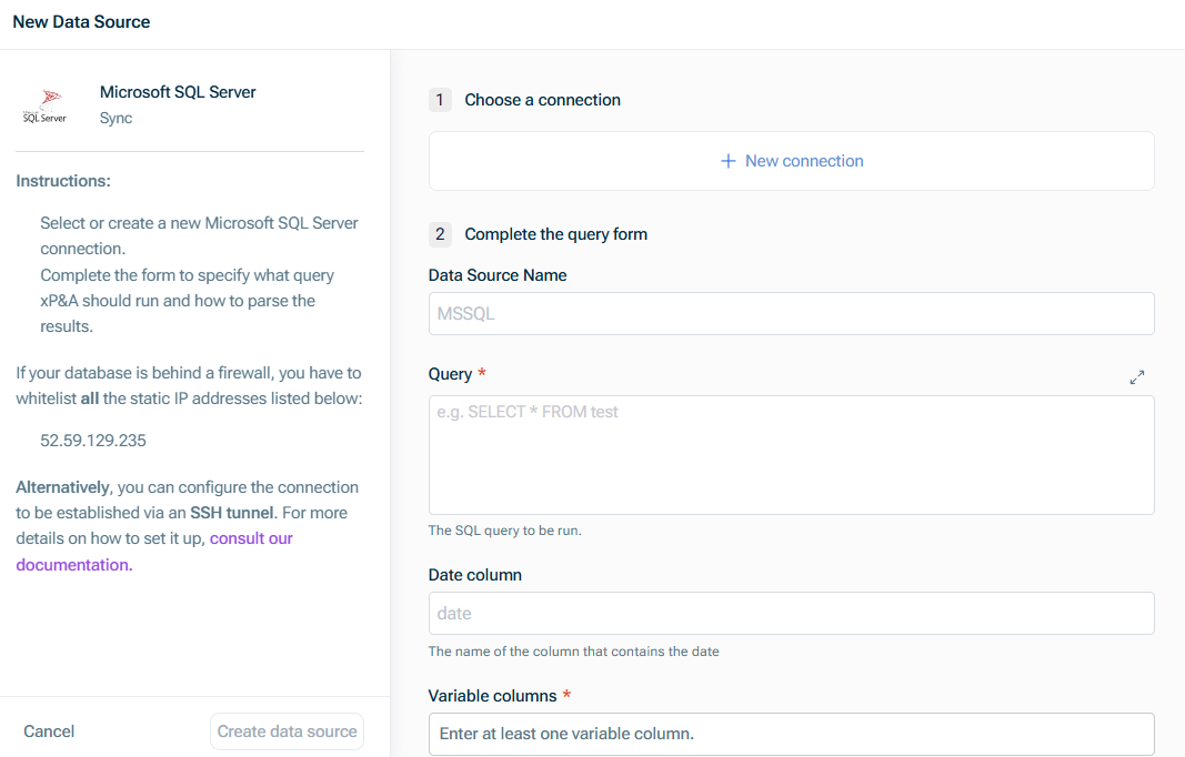 If your database is behind a firewall, you have to whitelist the following static IP address before connecting Microsoft SQL Server with xP&A: