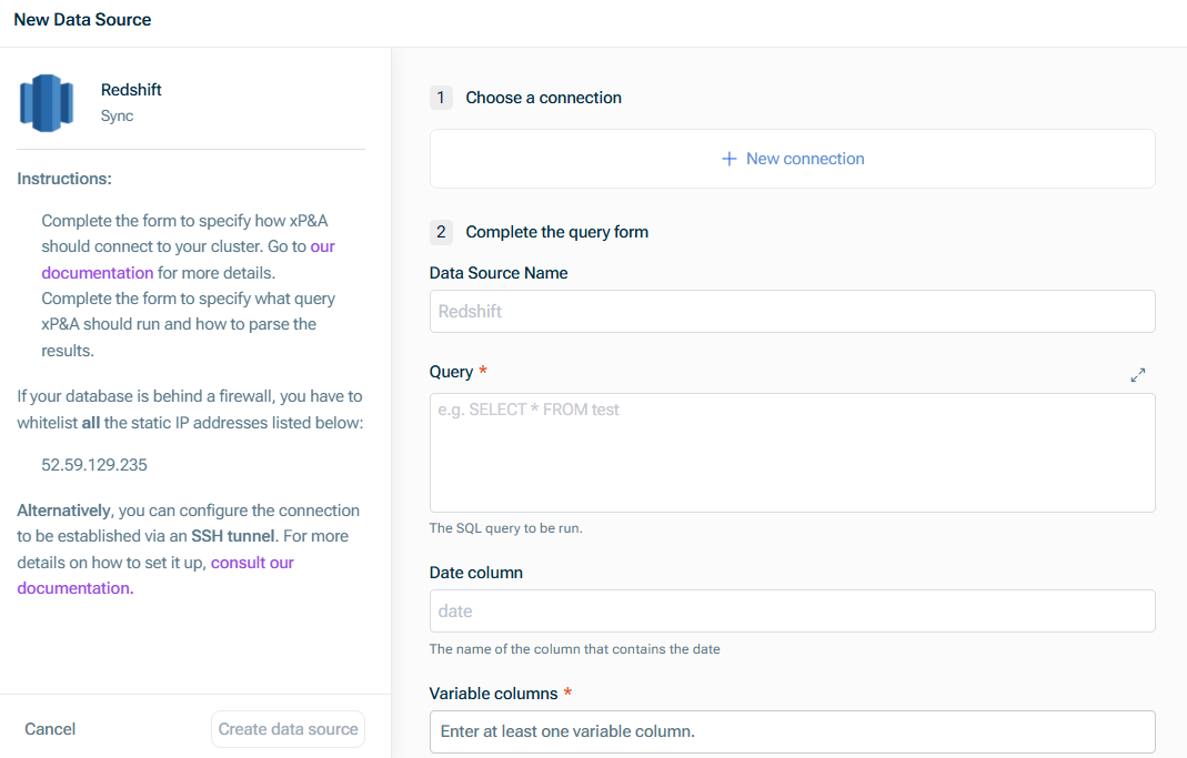 You have to whitelist the following static IP address before connecting Redshift with xP&A: 52.59.129.235