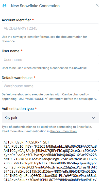 - Key pair: If you choose this option, copy the displayed key into your clipboard and execute this statement in Snowflake to associate xP&A's public key with the user you have configured.