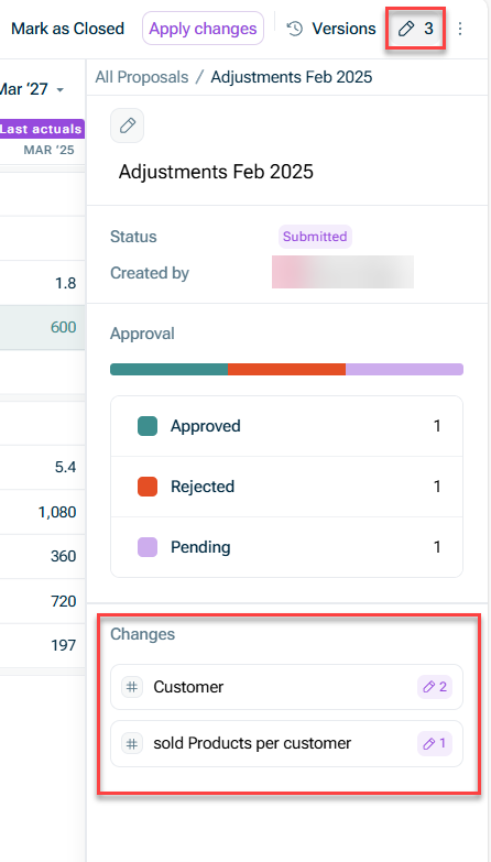Once you opened a proposal, you can see which cells have been edited. Hover over a cell to open the details of the change: