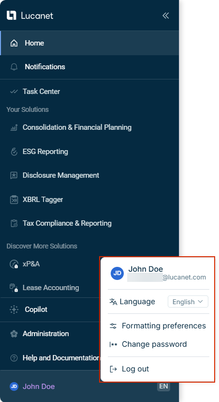 - User account area and Account menu: A new user account area at the bottom of the main menu displays your avatar, name, and selected language. Clicking anywhere in the user account area opens the Account menu, which provides quick access to Language, Formatting preferences, Change password, and Log out. To view your profile or manage consents, click the user info area at the top of the Account menu.