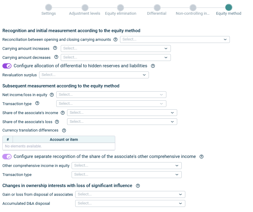 The app for equity elimination now supports the measurement of associated companies using the equity method. The following functions are currently supported: