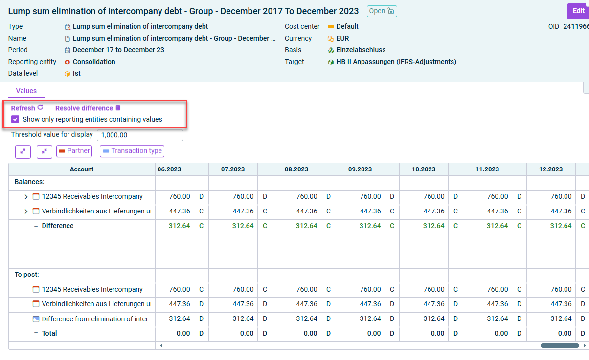 Detailed information about the currently supported and planned future range of functions for equity elimination in the CFO Solution Platform can be found under Equity elimination.
