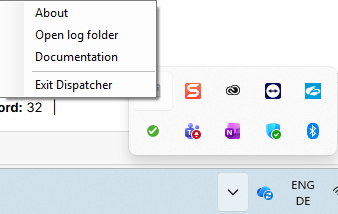 An icon for the Dispatcher—the component that opens documents from Lucanet Disclosure Management in MS Word or MS Excel—is now displayed in the MS Windows system tray. You will now receive status messages, e.g., when a document is opened. This allows you to easily see whether the Dispatcher is running, idle, or processing data. Right-clicking on the icon in the taskbar opens a context menu with various options. Among other things, you can close the Dispatcher without Task Manager or open the log files: