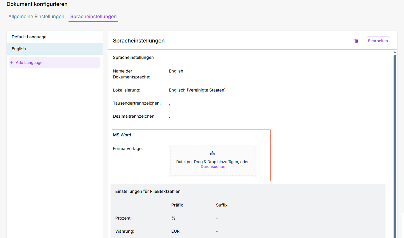 We have made the Configure Document workspace more user-friendly and optimized it for multilingual document support. General settings and language settings are now clearly separated. Each language has its own detail view—making individual adjustments more traceable.